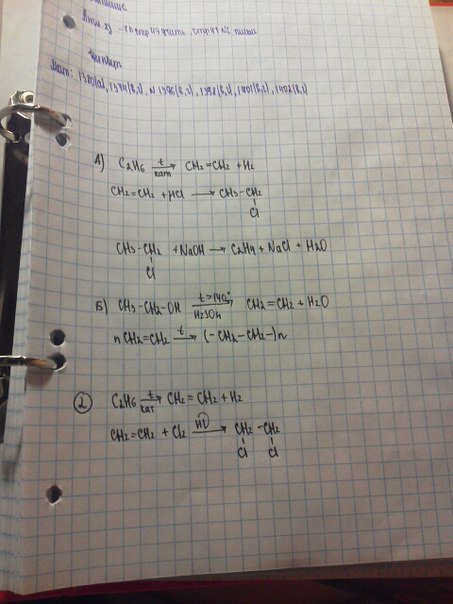 Помогите пожалуйста срочноооо!!!! Напишите уравнения реакции,соответствующие следующим схемам превращений: А) C2H6->C2H4->C2H5Cl->этилен