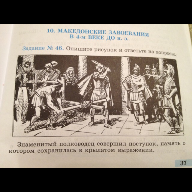 Если не ошибаюсь: полководец - Александр Македонский, изображен намеревающимся нанести удар мечом, намерен разрубить знаменитую загадку - гордиев узел, кто его развяжет, овладеет Азией.