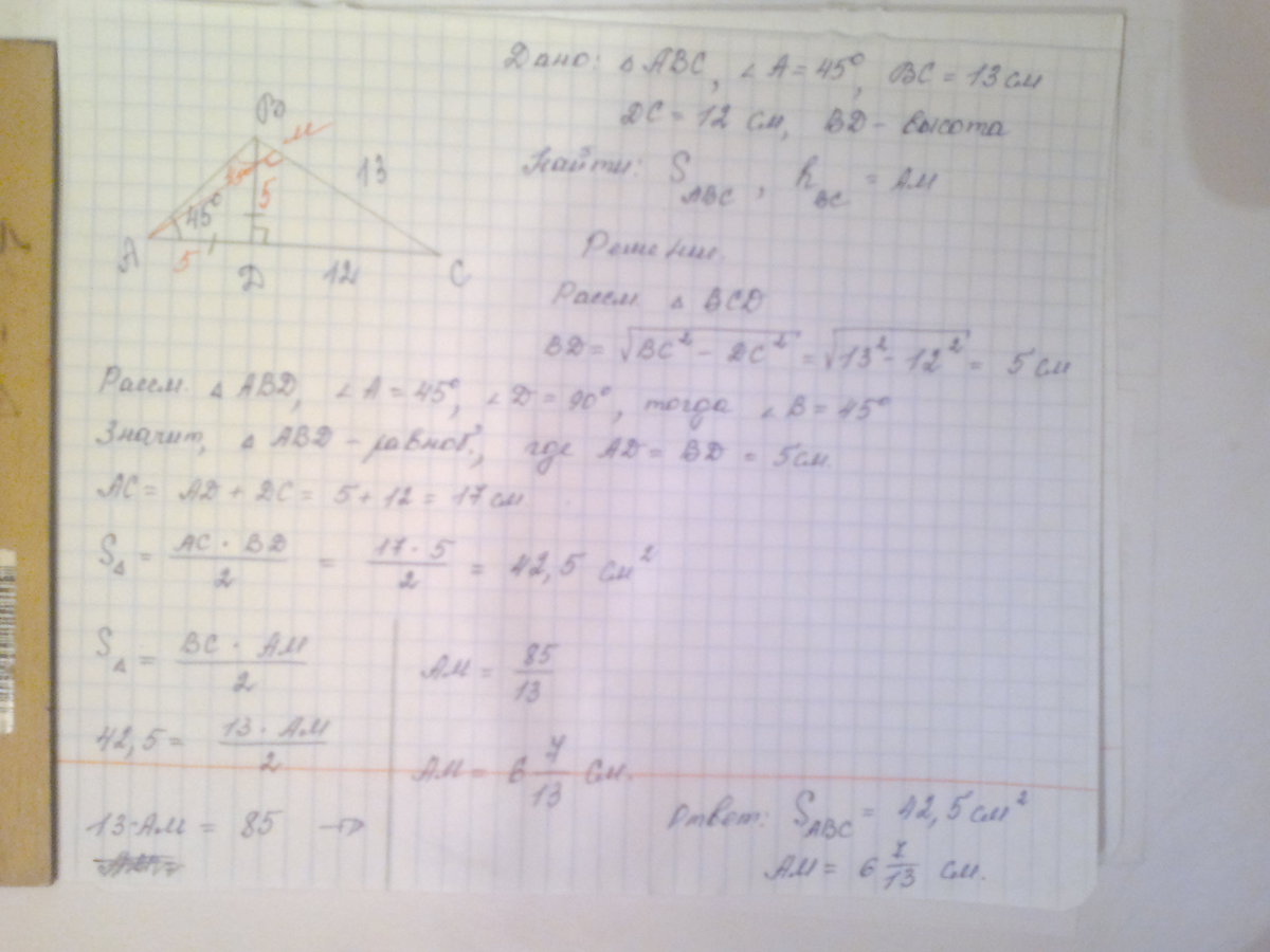 В треугольнике ABC угол A равен 45 градусов BC равен 13 см а высота BD отсекает на стороне AC отрезок DC равный 12 см найти площадь треугольника и высоту проводящую к отрезке BC