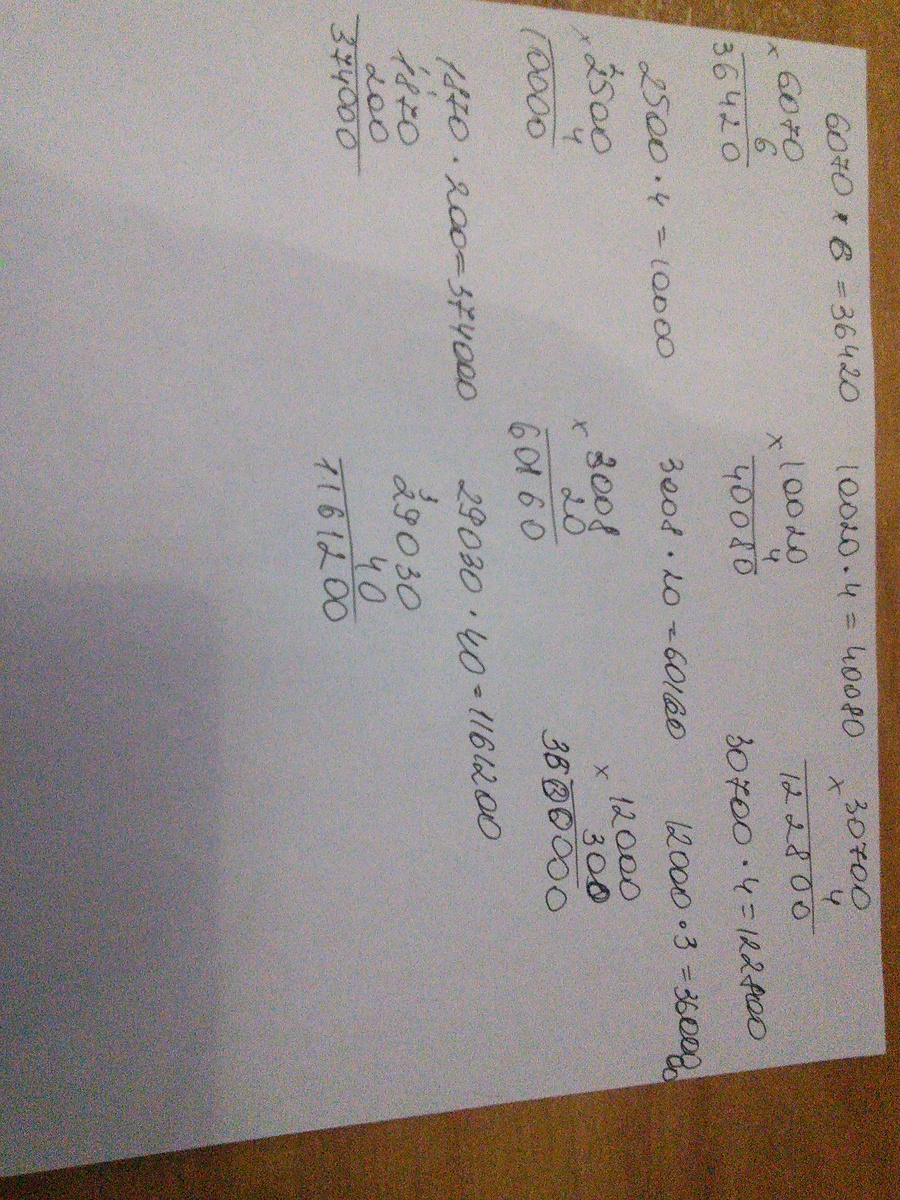 ычислите письменно 6070 * 6= ,10020 * 4=,30700*4=,2500*4=,3008*20=,12000*300=,1870*200=,29030*40= в столбик