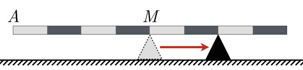 Однородная палка массой M=3 кг уравновешена на опоре. Опору передвигают вправо на α=0,25 длины балки. Какую вертикальную силу F требуется приложить к концу A балки для сохранения равновесия? Ответ выразить в Н , округлив до целых. Ускорение свободного падения g=10 м/c 2 .