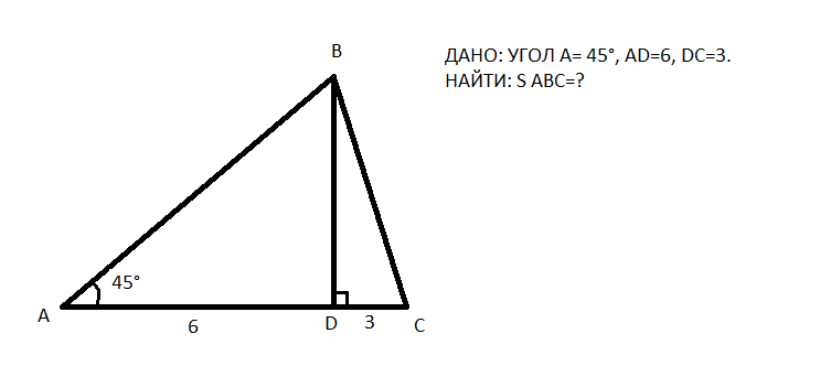 45 градусов ,треугольник абд равнобедренный ,ад=дв=6 см,s авс=1/2бд*ас=12*6*9=27 см