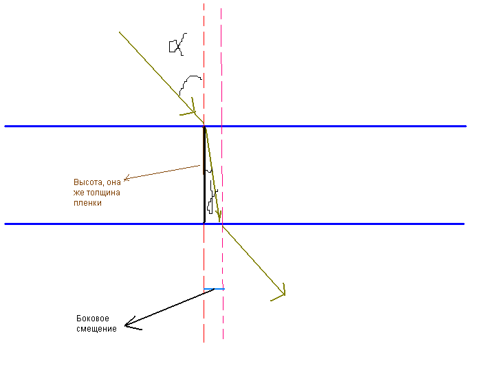 n = sin(a) / sin (гамма), sin(гамма) = 1,4/(2*1,47). Рассчитаем гимотенузу (внутри пленки как видите обозначенную лучом) sin(гамма) = d/L , L - длина гипотенузы, d - смещение луча. Вычислим L = 0,00088. По теореме пифагора вычислим высоту, являющейся толщиной пленки : H = sqrt(L^2 - d^2) после вычислений на калькуляторе получаем H = 0,81 * 10 в степени (-3). Появилась степень так как перевел в систему СИ длину бокового смещения.