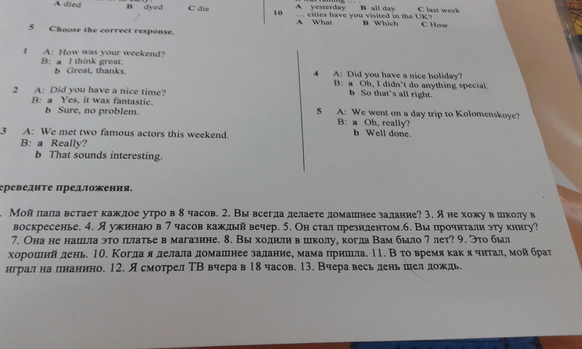 1)My dad gets up every morning at 8 o'clock in the morning. 2)You always do homework? 3) I don't go to school on Sunday.I'm having dinner at 7 o'clock every evening. 4)He became the President.You have read this book.5) She found this dress in the store. 6)Did you go to school when you were 7 years old? 7) It was a good day. 8)When I was doing homework, mom came. 9)When I read the book, my brother played the piano.10) I was watching TV yesterday in 18 hours. 11)All day yesterday it rained.