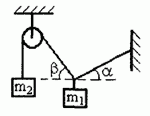 Грузы m1 и m2 висят на нити, перекинутой через неподвижный блок . В равновесии: α = 30°, β = 60°. Зная, что m2= 2 кг, найти m1.