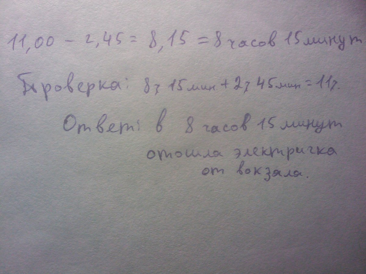 электричка идёт до конечной станции 2ч 45мин. Во сколько отошла электричка от вокзала, если на конечную станцию она прибыла в 11.00?