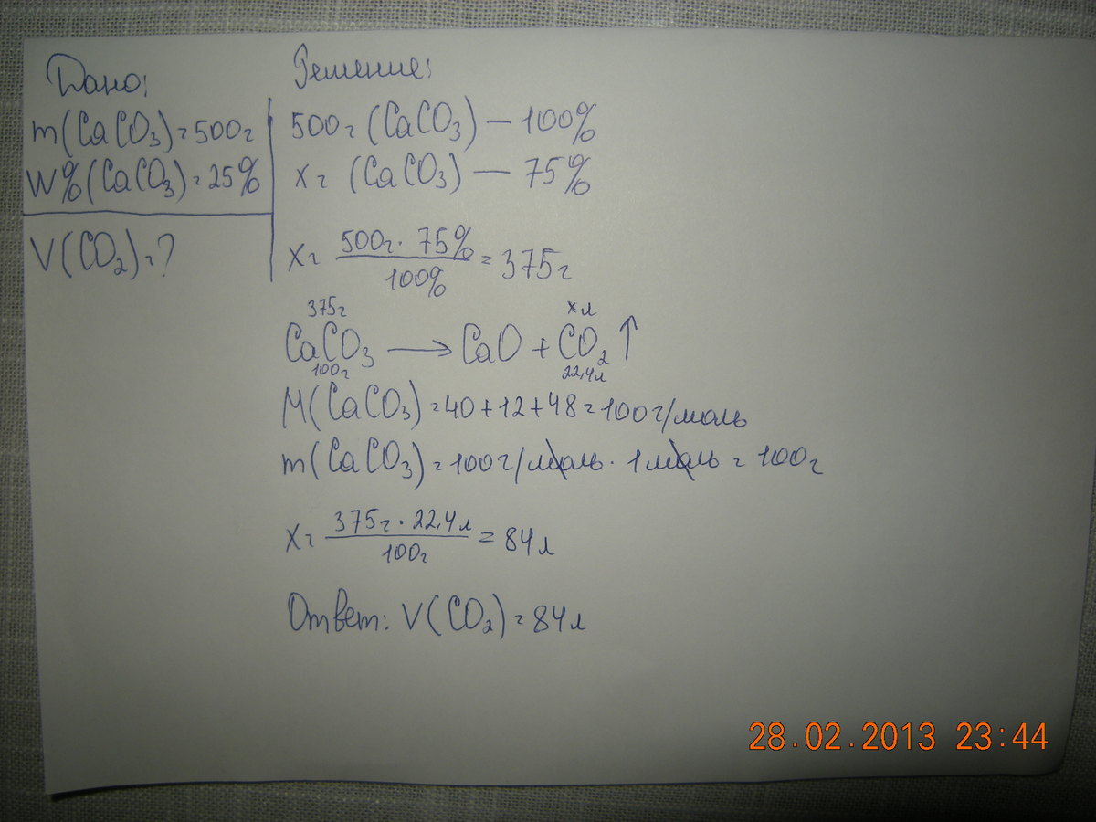 вычислите объем углекислого газа образующегося при обжиге 500 г известняка содержащего 25 % примесей