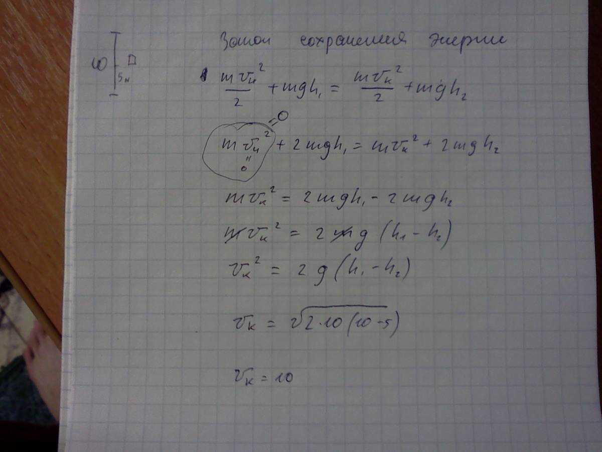 тело массой m= 2кг свободно падает вертикально вниз с высоты h = 10 м. Найдите скорость тела на высоте 5 м.