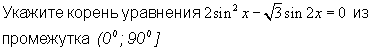 Укажите корень уравнения 2sin²x-√3sin2x=0 из промежутка (0°;90°] ( Смотри во вложении)