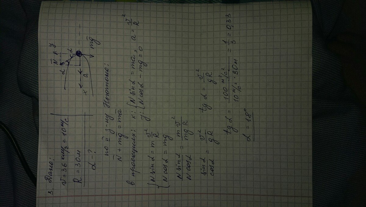 3. Конькобежец движется со скоростью 36 км/час, на повороте радиусом 30 м он наклоняется чтобы сохранить равновесие. найдите угол отклонения от вертикали?(Написать размерность)
