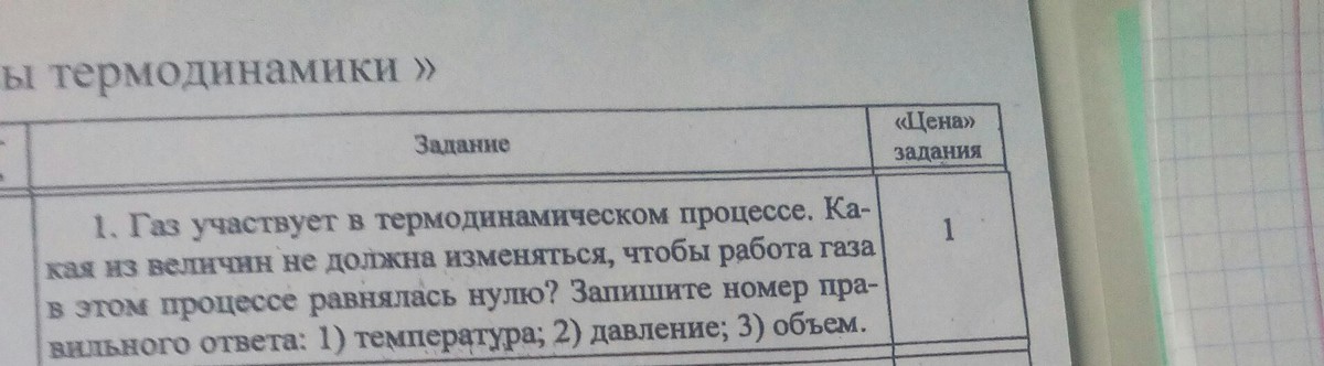 объем: если объем газа не меняется, то газ не расширяется и не совершает работы сам, не поднимает поршень) и не сжимается (поршень не сжимает газ), а вообще А=РΔV, т.е. если объем не меняется. работа газа ноль, а вот если давление не меняется (изобарный процесс) , то газ вполне может изменять свой объем и при постоянном давлении, а значит работа отлична от нуля