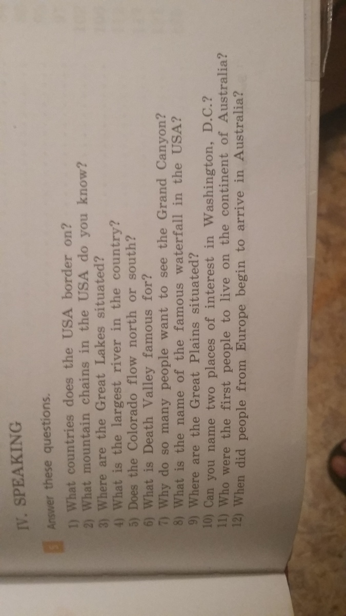 1) The USA border on Canada and Mexico. 2) Mountain chains in the USA are Cordilleras, Appalachians. 3) The Great lakes are situated in North America in USA and Canada. 4) Mississippi is the largest river in the country. 5) The Colorado flows south. 6) The Death Valley famous for the highest temperature in the world. 7) Many people want to see the Grand Canyon because the Grand Canyon is one of the deepest canyons in the world. 8) The Niagara Falls is the famous waterfall in the USA. 9) The Great Plains are situated in USA and Canada. 10) The White house and the Lincoln Memorial are two places of interest in Washington. 11) I don't know who were the first people to live on the continent of Australia. 12) People from Europe began to arrive in Australia in 1606.