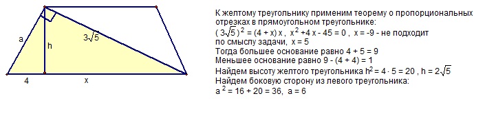 Пожалуйста! Можете писать решение задачи по русски! По действиям!!! Діагональ рівнобічної трапеції перпендикулярна до бічної сторони і дорівнює 3√5 см, а його проекція бічної сторони на більшу основу дорівнює 4 см. Знайдіть основи трапеції та її бічну сторону.