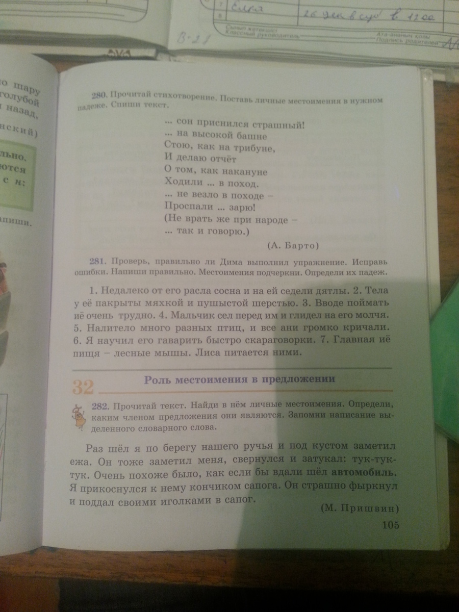 1)Недалеко от него (р.п.)росла сосна,и на ней (пр.п)сидели дятлы.2)Тело у неё(р.п.) покрыто мягкой и пушистой шерстью ИЛИ Тела у них(р.п.) покрыты мягкой и пушистой шерстью.(или местоим.поменять или число с мн.на ед.). 3)Вроде поймать её (в.п.) очень трудно(не видно что написано ЕЕ или НЕ очень трудно). 4)Мальчик сел перед ним (т.п) и смотрел на него(в.п.) молча. 5) Налетело много разных птиц , и все они (и.п.) громко кричали. 6)Я (и.п.) научил его(в.п.) говорить быстро скороговорки.7)Главная её (р.п.)пища-лесные мыши.Лиса питается ими(т.п.).