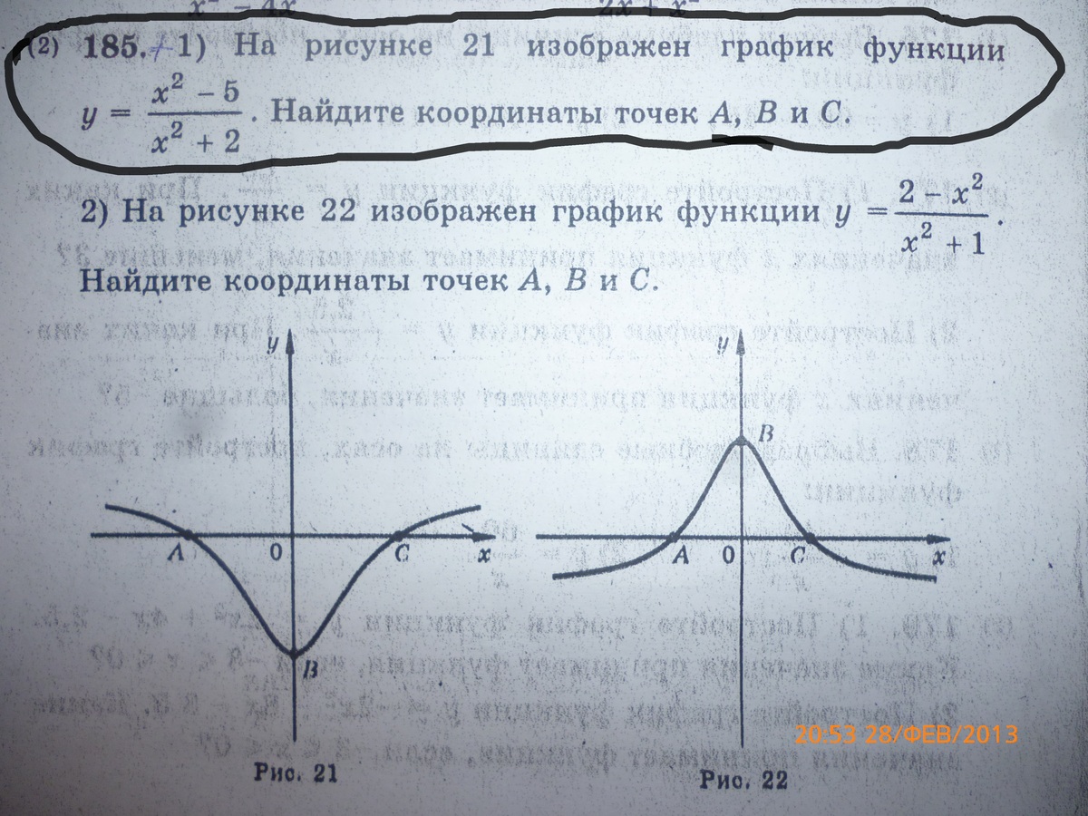 Если внимательно посмотреть на рисунок, то можно увидеть, что точки А и С имеют некоторые координаты х, а координата у равна нулю(потому что точки лежат на оси х). Подставляем в изначальное выражение у=0: (x^2-5)/(x^2+2)=0 и решим это уравнение: частное равно нулю, когда числитель равен нулю: значит X^2-5=0, x^2=5, отсюда х1=корень из пяти, х2=-корень из пяти. Значит координата точки А(-корень из пяти;0), а точки С(корень из пяти;0). А у точки В х=0, подставляем в уравнение: 0-5/0+2=-5/2=-2,5. Значит ее координаты (0;-2,5)