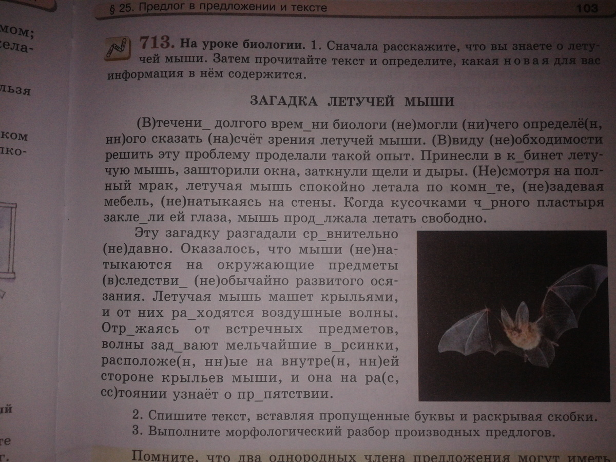 В течение долгого времени биологи не могли ничего определённого сказать насчёт зрения летучей мыши. Ввиду необходимости решить эту проблему проделали такой опыт. Принесли в кабинет летучую мышь, зашторили окна, заткнули щели и дыры. Несмотря на полный мрак, летучая мышь спокойно летала по комнате, не задевая мебель, не натыкаясь на стены. Когда кусочками чёрного пластыря заклеили ей глаза, мышь продолжала летать свободно. Эту загадку разгадали сравнительно недавно. Оказалось, что мыши не натыкаются на окружающие предметы вследствие необычайно развитого осязания. Летучая мышь машет крыльями, и от них расходятся воздушные волны. Отражаясь от встречных предметов, волны задевают мельчайшие ворсинки, расположенные на внутренней стороне крыльев мыши, и она на расстоянии узнаёт о препятствии. Производные предлоги: в течение, ввиду, несмотря на, вследствие, насчет. В течение (времени) - предлог . Не могли сказать х ( в течение чего ? ) в течение времени ( р.п.) производный, неизм. Ввиду - предлог, решить х ( в виду чего ? ) ввиду необходимости ( р.п.) , простой, производный, неизм. Несмотря на - предлог , летала х ( несмотря на что ? ) на мрак ( в.п.). Составной, производный, неизм. Вследствие - предлог, не натыкаются ( вследствие чего ? ) вследствие осязания ( р.п.), простой, производный, неизм. Насчет - предлог, не могли сказать х ( насчет чего ? ) насчет времени ( р.п.) производный, неизм.