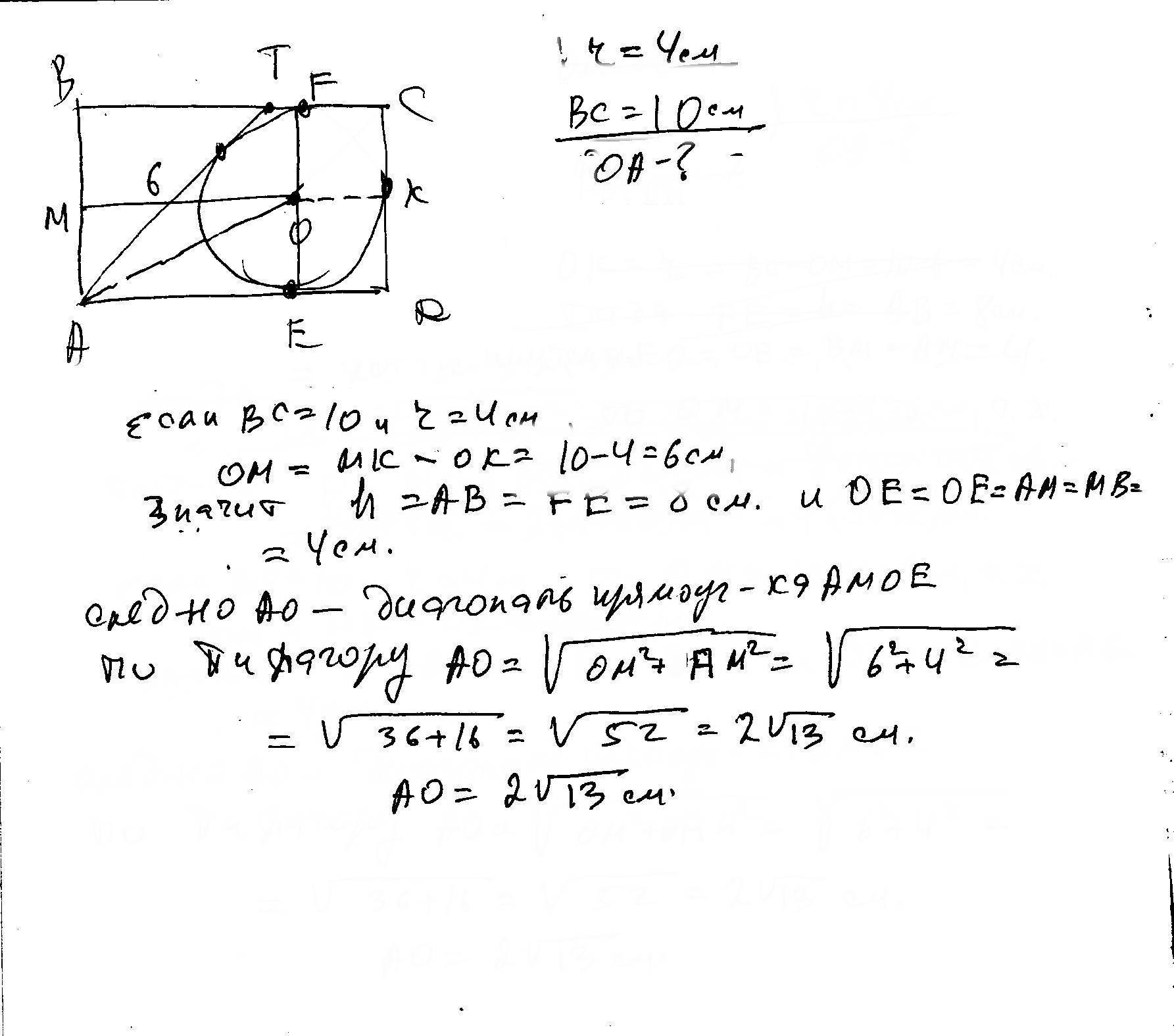 В прямоугольнике АВСД равен 10 см . Точка Т-внутренняя точка отрезка ВС. в четырехугольник АТСД вписана окружность известно, что длин радиуса окружности равно 4 см. вычислите расстояние от центра окружности до точки А