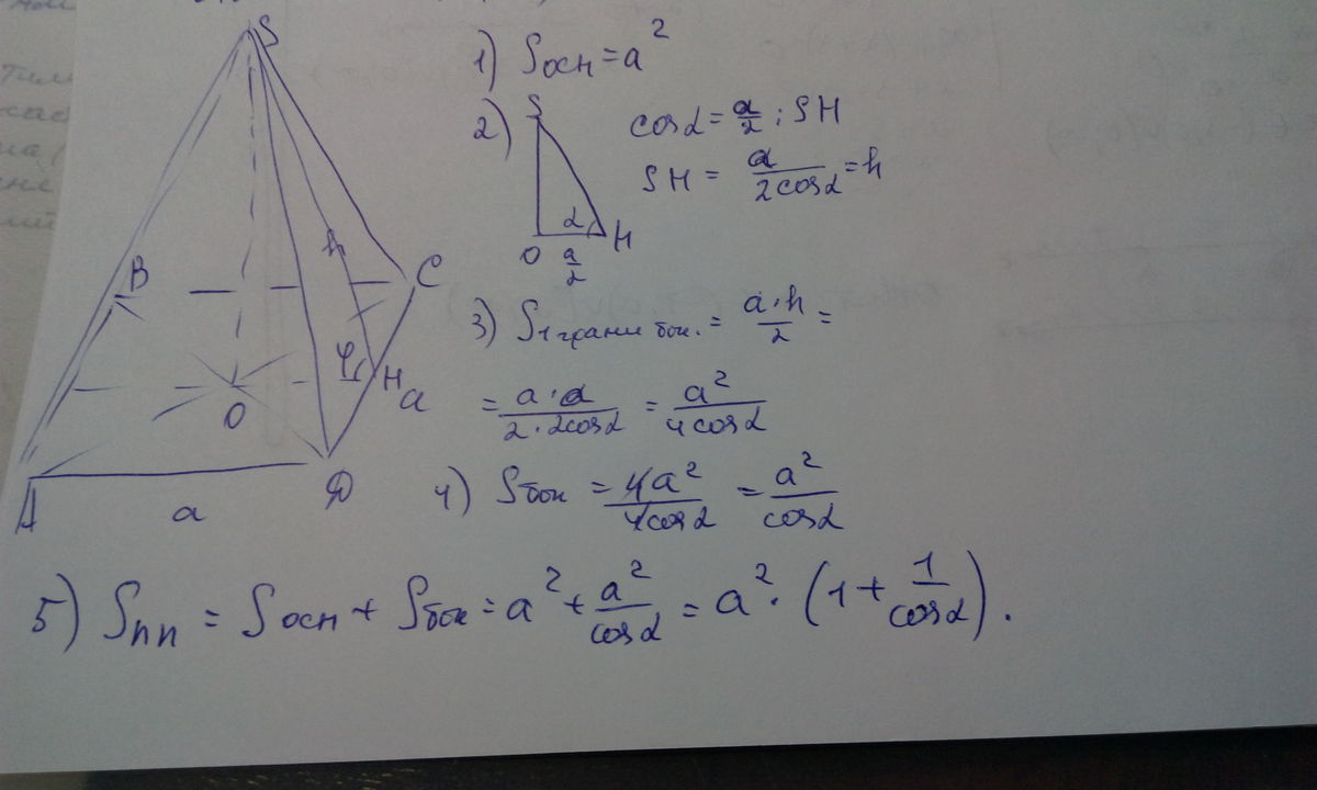 в правильной четырехугольной пирамиде боковая грань наклонена к плоскости основания под углом φ Найдите площадь полной поверхности пирамиды если ребро её основания равна а.