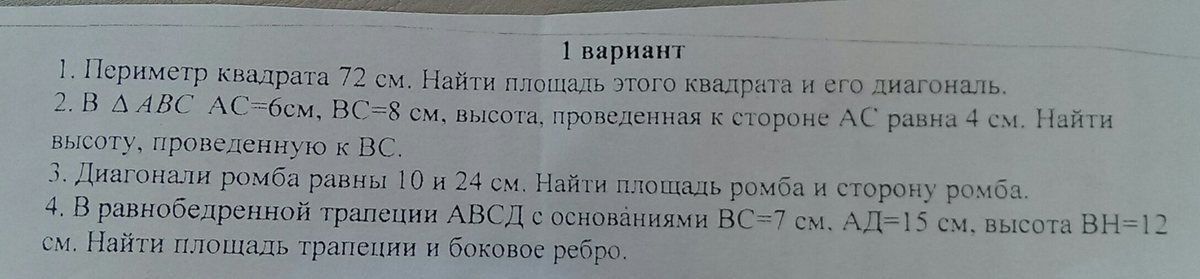 1)сторона квадрата 18; S=a*a=324; диагональ=гипотенузе=18/sin45=18/корень из 2/2=18корней из 2 2) высота ВД=4; вторая высота АЕ; треуг.АЕС подобен треуг.ВДС по 2-м углам (угол С общий); АС/ВС=АЕ/ВД; 6/8=АЕ/4;АЕ=3. 3) диагонали ромба перпендикулярны и делят его на 4 равных прямоуг.треуг. катеты 12 и 5; по пифагору сторона ромба в квадрате =144+25=169; строна=13; S=12*10=120. 4) проведем высоты ВН, СЕ; ВС=7,НЕ=7; АН=(15-7)/2=4; в треугольникеАВН АВ в квадрате=16+144=160; АВ=4корня из 10; S=(7+15)/2 и*12=132.