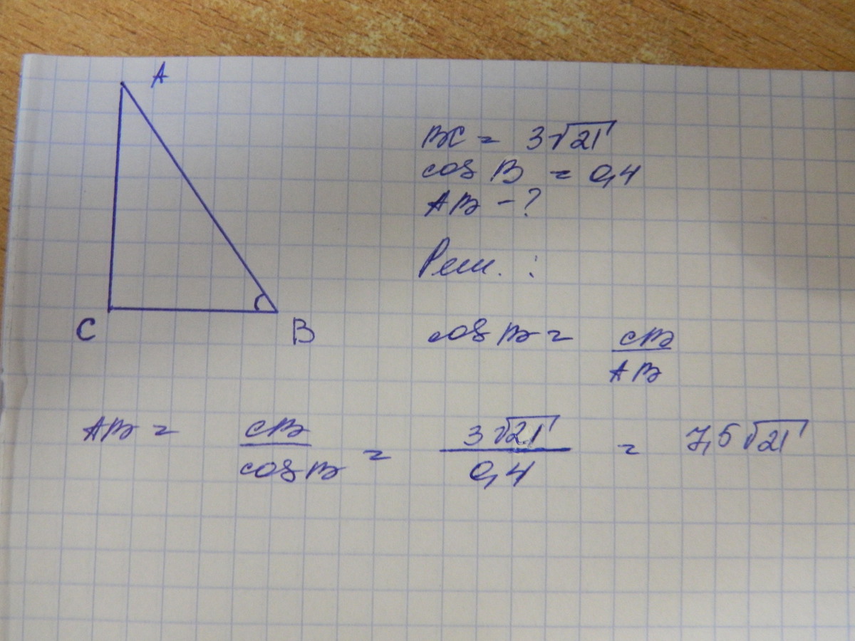 Косинус угла-отношение прилежащего катета к гипотенузе.Нужно из определения косинуса выразить искомую сторону.