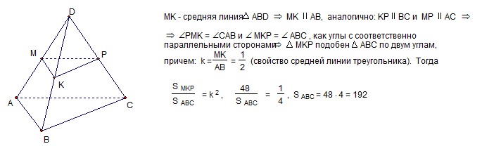 В тетраэдре ABCD точки М, К и Р— середины ребер AD, BD и DC. Докажите, что плоскость МКР параллельна плоскости ABС, и найдите площадь треугольника AВС, если площадь треугольника МКР равна 48 см2.