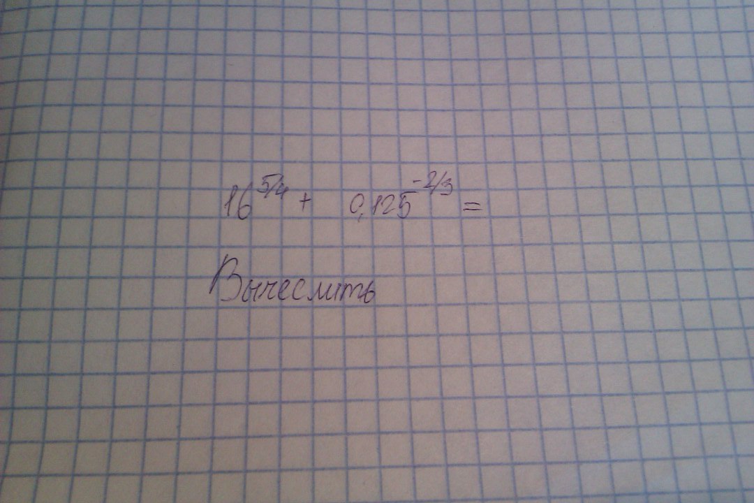 16⁵/⁴ + 0,125⁻²/³ = (2⁴)⁵/⁴ + (0,5³)⁻²/³ = 2⁵ + 2² = 32 + 4 = 36