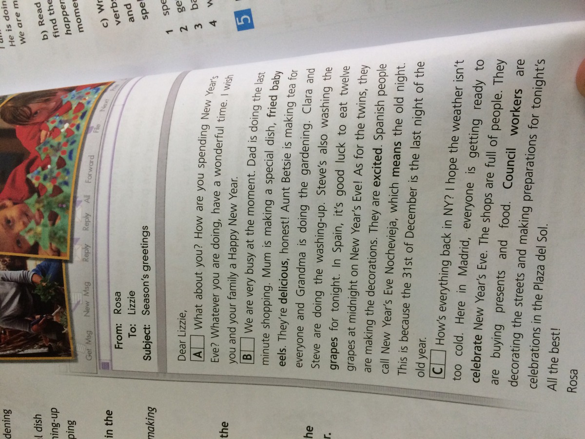 C. Когда вы все вернетесь в Нью Йорк? Я надеюсь погода не будет слишком холодной. Здесь в Мадрите все готовы праздновать Новый год. Магазины полны людей. Они покупают подарки и еду. Совет работников украшают улицы и делают подготовку для ночного праздника в Плазе Дел Сол.