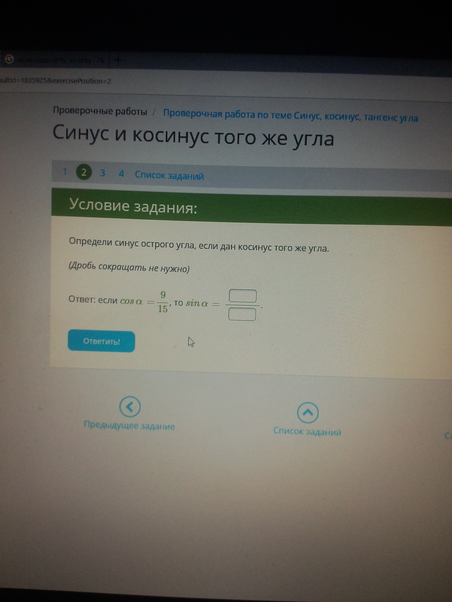 Определить синус острого угла, если дан косинус того же угла. Если cosa= 9/15, то sina=