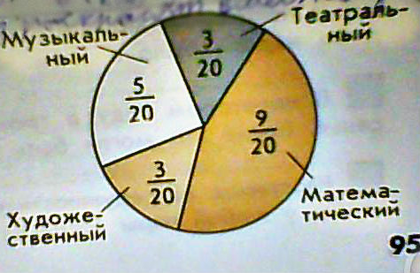 Круг обозначает цело: всех четвероклассников, посещающих кружки. 1) В каком кружке больше всего учеников. ? 2)В каком кружках одинаковое число учащихся? 3)В каком кружке больше учащихся: в музыкальном или в художественном?