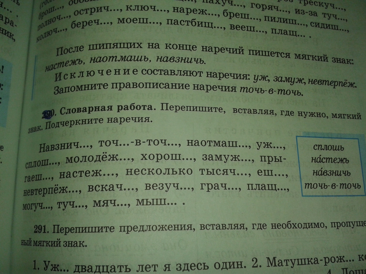 Навзничь, точь-в-точь, наотмашь, уж, сплошь, молодежь, хорош, замуж, прыгаешь, настежь, несколько тысяч, ешь, невтерпеж, вскачь, везуч, грач. плащ, могуч, туч, мяч, мышь.