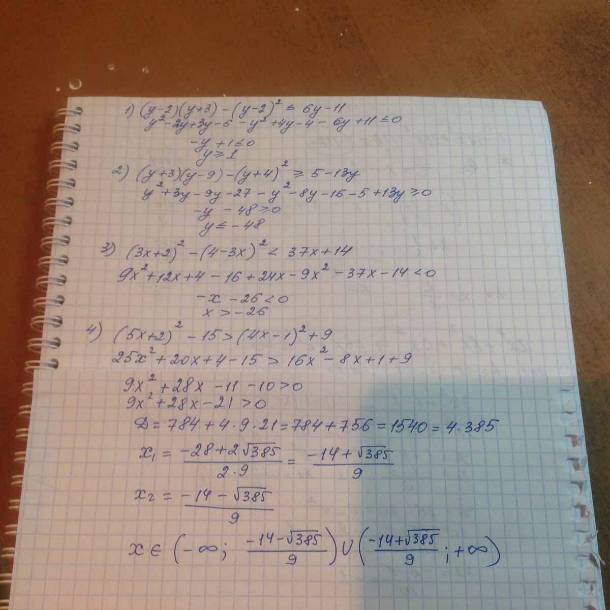 2) (y+3)(y-9)-(y+4)^2>=5-13y;