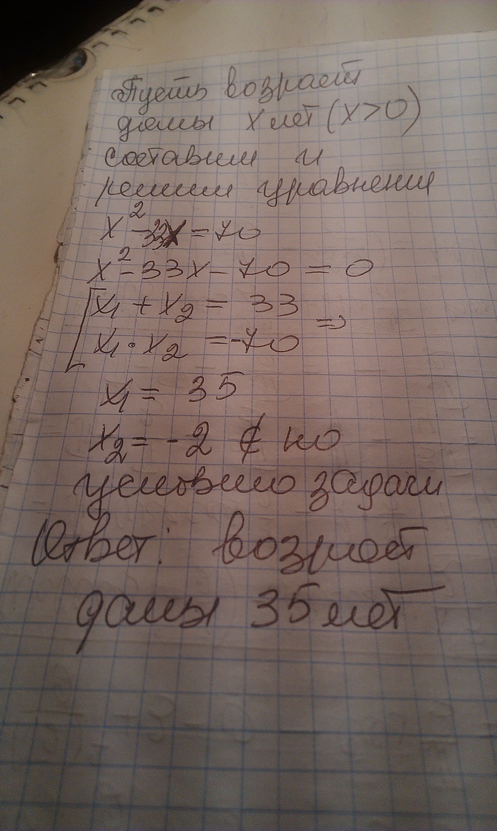 помогите!!!!!!! одна дама сказала: если мой возраст возвести в квадрат и из полученного результата вычесть мой возраст умноженный на 33 то получится 70. Определите возраст дамы. SOS помогите плиз заранее СПАСИБО