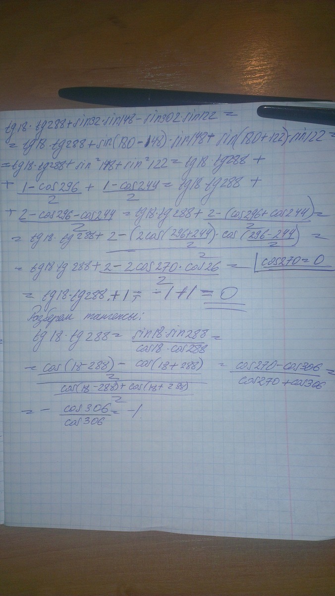 Сначала для синусов применяешь формулу приведения, получаешь квадраты синусов, далее, формула понижения степени функции, после для получившихся косинусов применяешь формулу суммы косинусов, получаешь табличное данное cos(270)=0. Остается произведение тангенсов, которые мы не трогали, плюс единичка. Теперь тангенсы - расписываешь как отношение синуса к косинусу, применяешь формулу произведения синусов и произведения косинусов, получаешь разность косинусов в числителе, и сумму косинусов в знаменателе. И в числителе и в знаменателе наблюдаешь табличное данное Cos(270)=0. А остальное сокращаешь, получаешь -1. Теперь возвращаемся в наш пример, -1+1=0. Это и будет ответ.