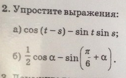 а)cos ( t - s ) - sint sins=costcos s+sintsins-sintsins=costsos sб) 1/2cosα - sin ( π/6+α)=1/2cosa-sinpi/6cosa-cospi/6sina=1/2cosa-1/2cosa-V3/2sina=-V3/2sina
