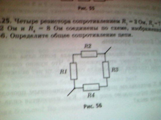 Четыре резистора сопротивлением R1=3 Ом, R2=7 Ом, R3=2 Ом, R4=8 Ом соединены по схеме, изображённой на рис. 56. Определите общее сопротивление цепи.