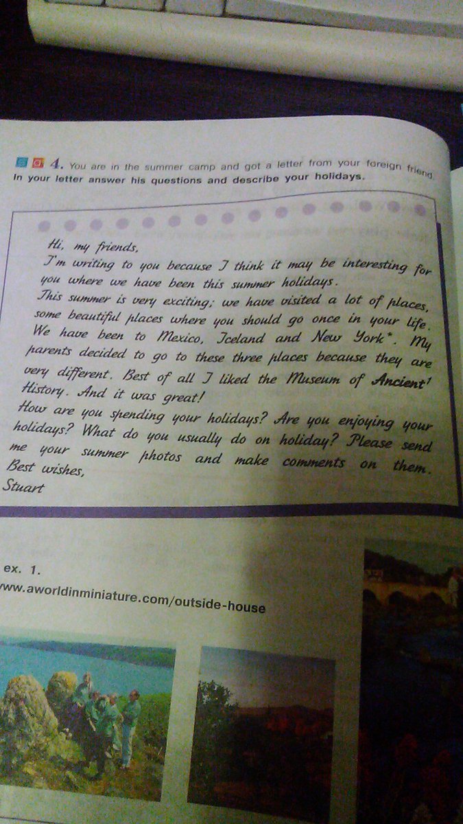Я пишу вам, потому что я думаю вам будет интересно узнать где мы провели эти летние каникулы. Это лето было очень захватывающим: мы посетили много мест, те места где ты просто должна побывать хоть раз в своей жизни. Мы были в Мексике, Исландии и Нью-Йорке. Мои родители решили посетить 3 этих места потому что они очень разные. Больше всего мне понравился Музей Древней Истории. И это было прекрасно!