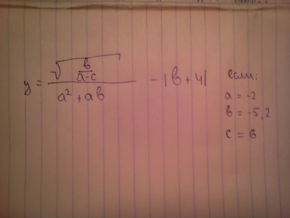 y:=(sqrt((b/a-c))/(sqr(a)+a*b))-(abs(b+4))