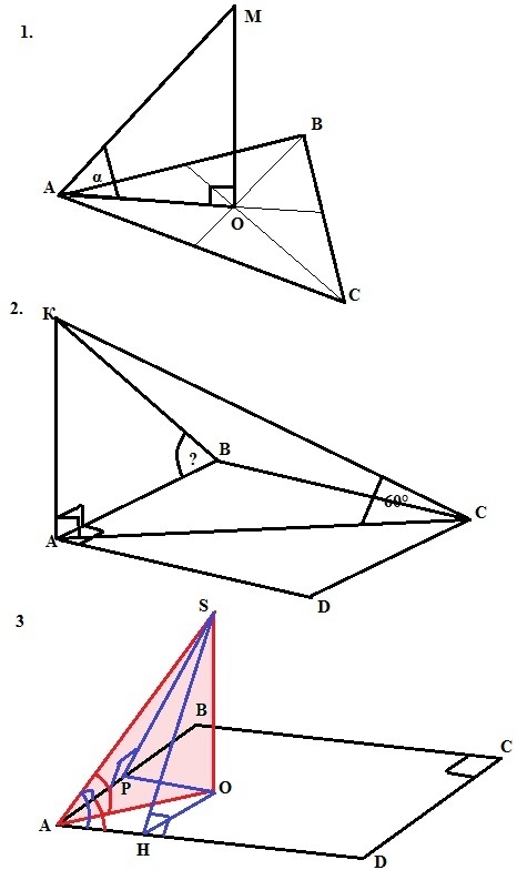 1. Угол между наклонной к плоскости и плоскостью - это угол между наклонной и ее проекцией на плоскость. Искомый угол - угол МАО. Высота правильного треугольника равна h=(√3/2)*a = (√3/2)*2√3=3. АО=(1/3)*h = 1 (свойство медианы). Tg(<MAO) = MO/AO = √3.
