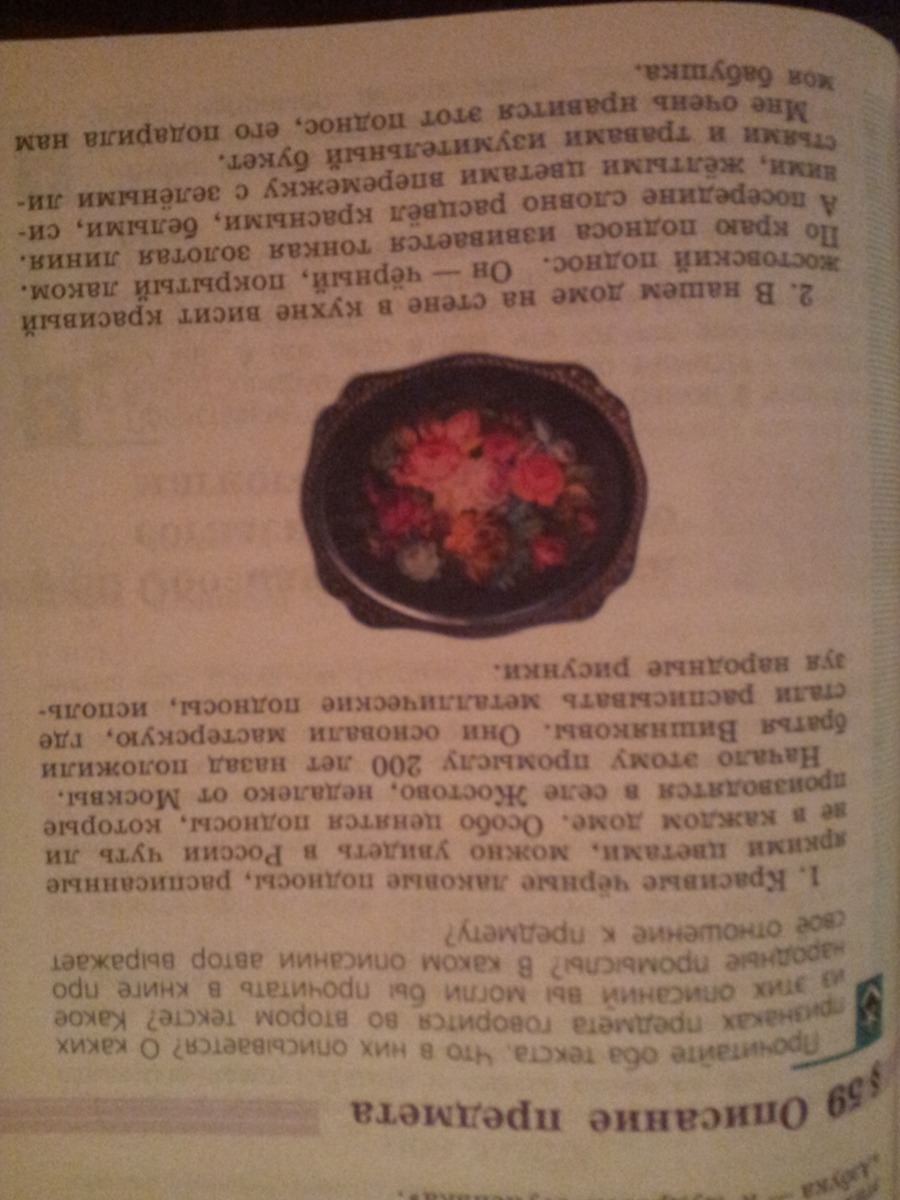 Пожалуйста мне надо сочинить!!!Прочитайте оба текста.Что в них описывается?О каких признаках предмета говорится во втором тексте?Какое из этих описаний вы могли бы прочитать в книге про народные промысли?В каком описании автор выражает свое отношение к предмету?
