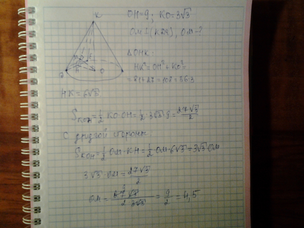 Отрезок DE-хорда основания конуса, которая удалена от оси конуса на 9 см. KO-высота конуса, причем KO=3 корня из 3 см. Найдите расстояние от точки О (центр основания конуса) до плоскости, проходящей через точки D, E и К.