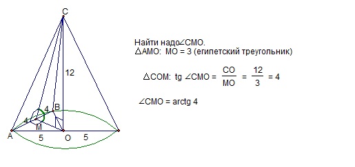 использовано свойство высоты равнобедренного треугольника, определение угла между плоскостями, теорема о трех перпендикулярах, египетский треугольник или теорема Пифагора, определение тангенса угла в прямоугольном треугольнике