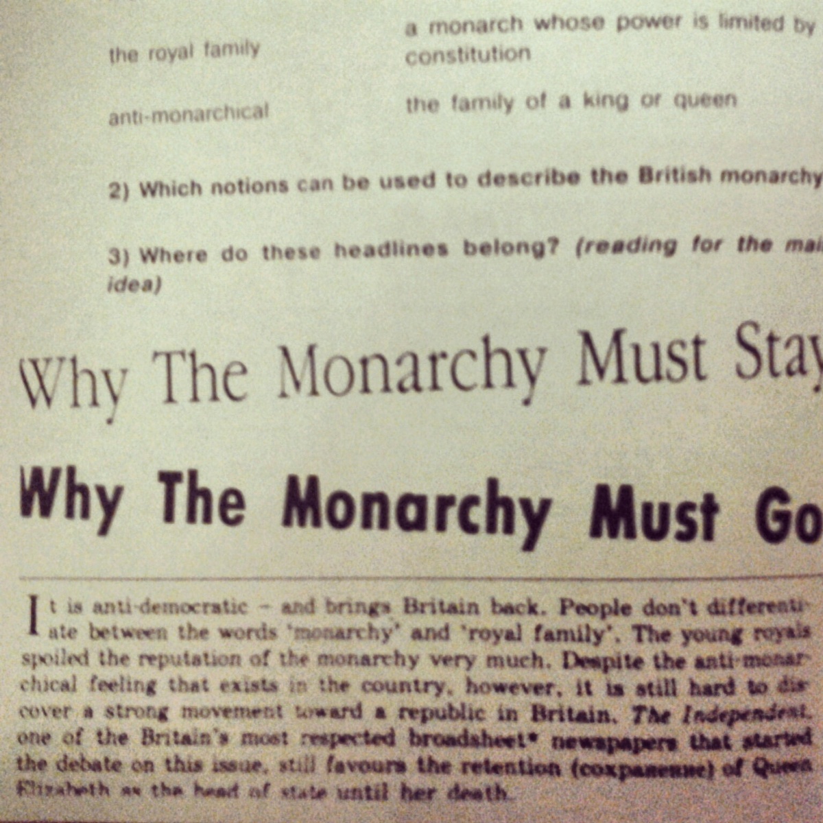 Это антидемократически - и возвращает Великобританию(первое не уверена как правильно перевести). Люди не дифференцируют между словами 'монархия' и 'королевская семья'. Молодые члены королевской семьи очень испортили репутацию монархии . Несмотря на антимонархическое чувство, которое существует в стране, однако, все еще трудно обнаружить сильное движение к республике в Великобритании. "Независимость", один из наиболее уважаемых плакатов ,газет великобритании который начал дебаты на эту проблема, все еще одобряет сохранение королевы Элизабет как главы государства до ее смерти.