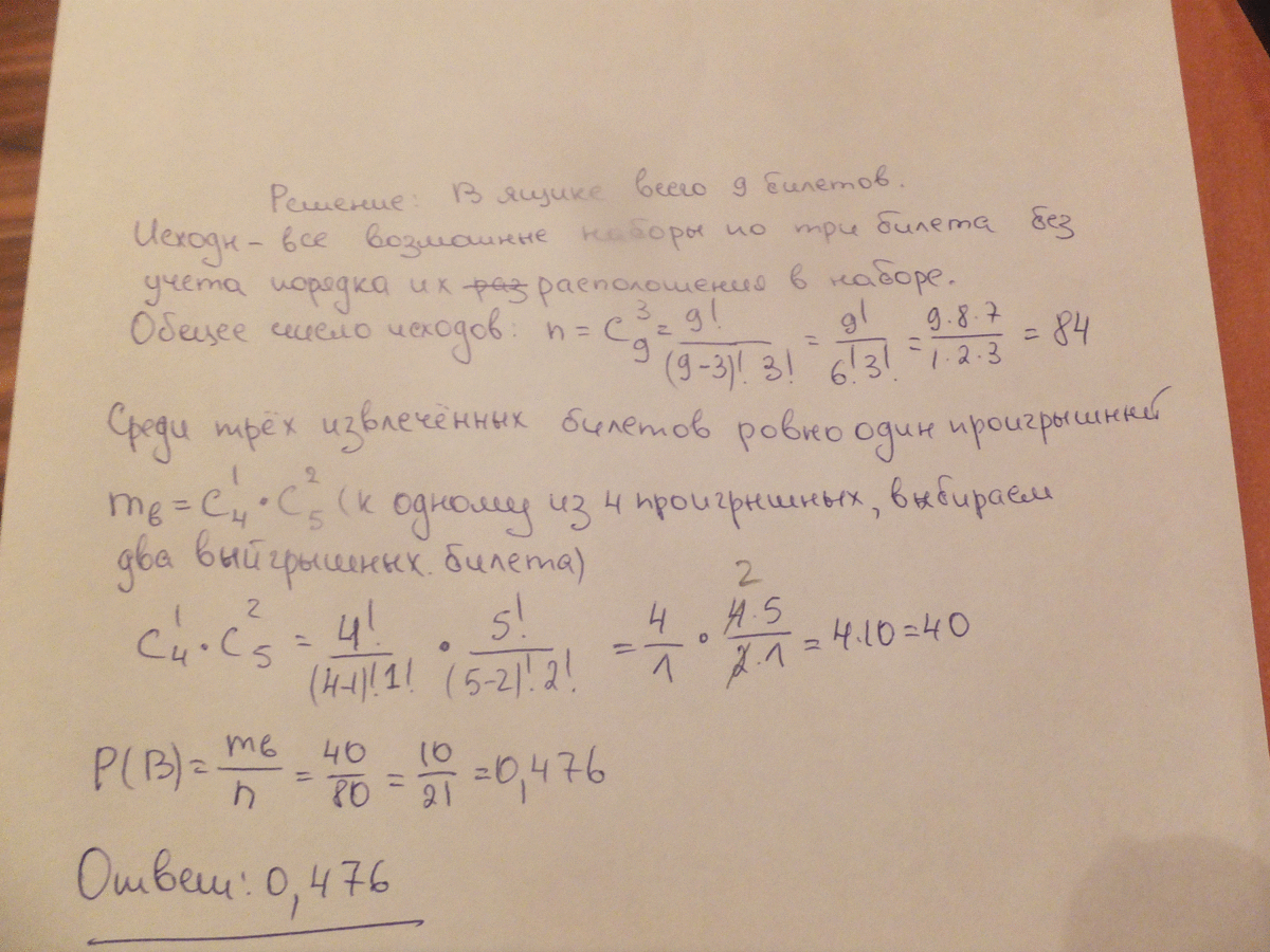 В ящике всего 9 билетов. Исходы – все возможные наборы по 3 билета без учёта порядка их расположения в наборе; общее число исходов . В – «среди трёх извлеченных билетов ровно один проигрышный»