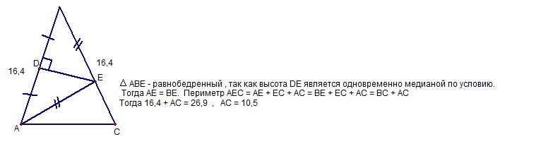 Рассмотрим треугольник АВЕ. Он равнобедренный, т.к. его высота ДЕ является и медианой ,АЕ=ВЕ.Обозначим длину этих отрезков через х: АЕ=ВЕ=х. Но так как ВС=АВ по условию, то СЕ=ВС-х=16,4-х. Периметр ΔАЕС равен АЕ+ЕС+АС=26,9,