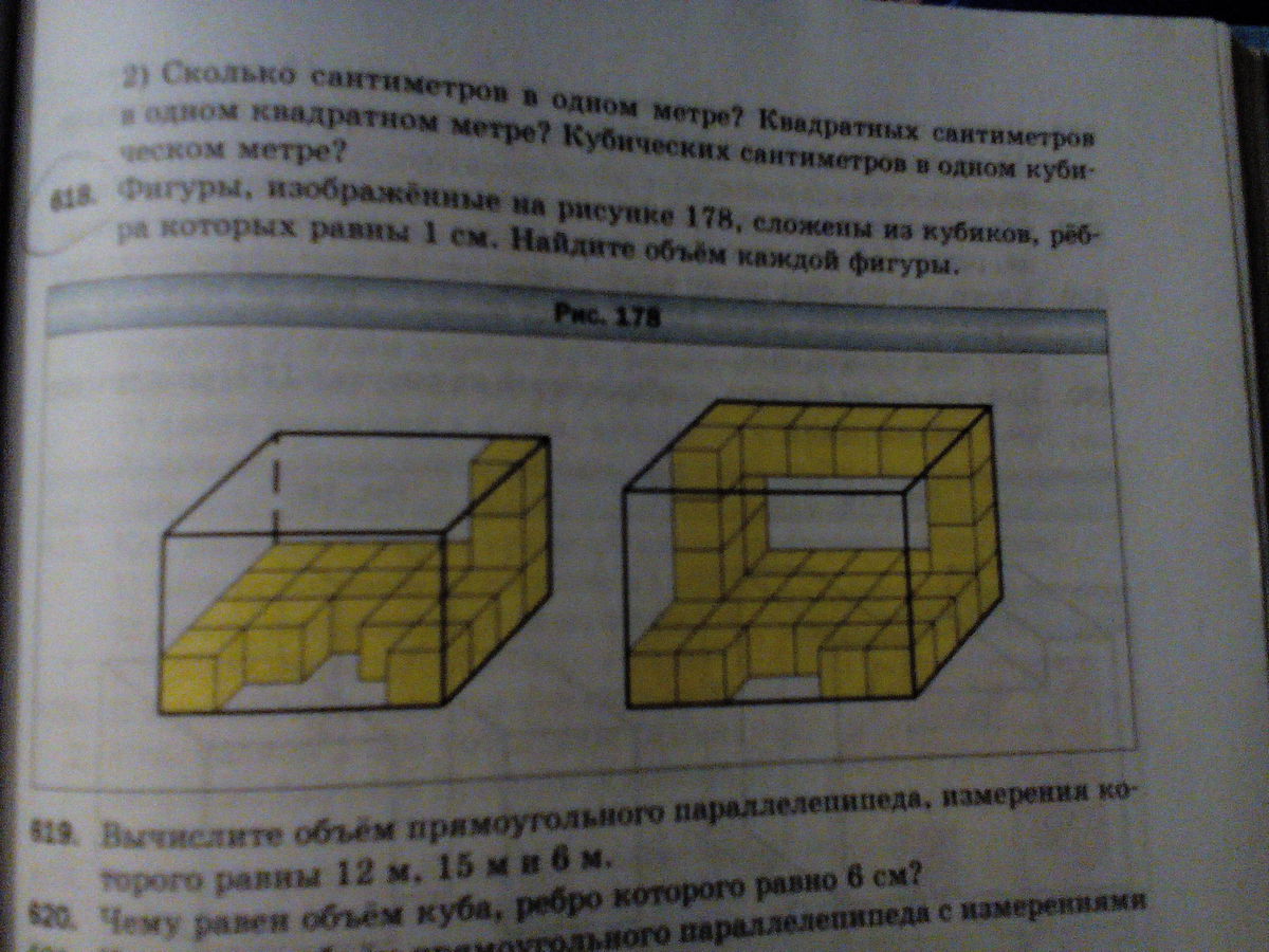 Фигуры, изображённые на рисунке, сложены из кубиков, рёбра которых равны 1 см. Найдите объём каждой фигуры