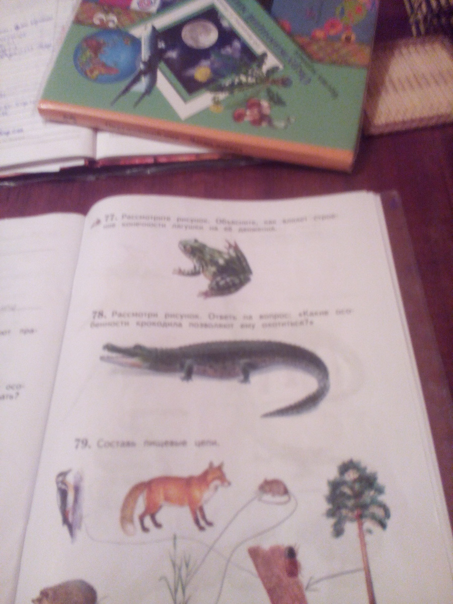 78: Рассмотрите рисунок. Ответь на вопрос: "Какие особенности крокодила позволяют ему охотиться?"