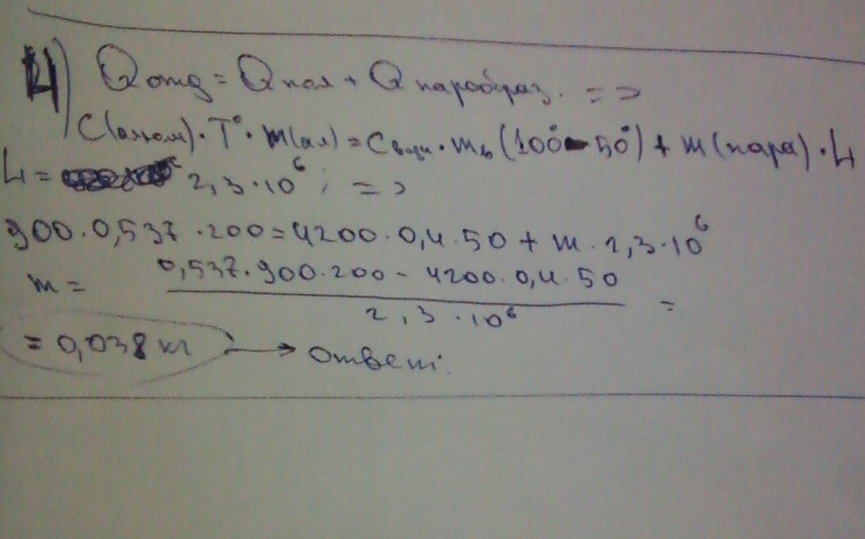 №4. Кусок алюминия массой 537 г, нагретый до 200 0С, погрузили в 400 г воды при 16 0С. При этом часть воды испарилась, а оставшаяся вода приобрела температуру 50 0С. Определите количество испарившейся воды.