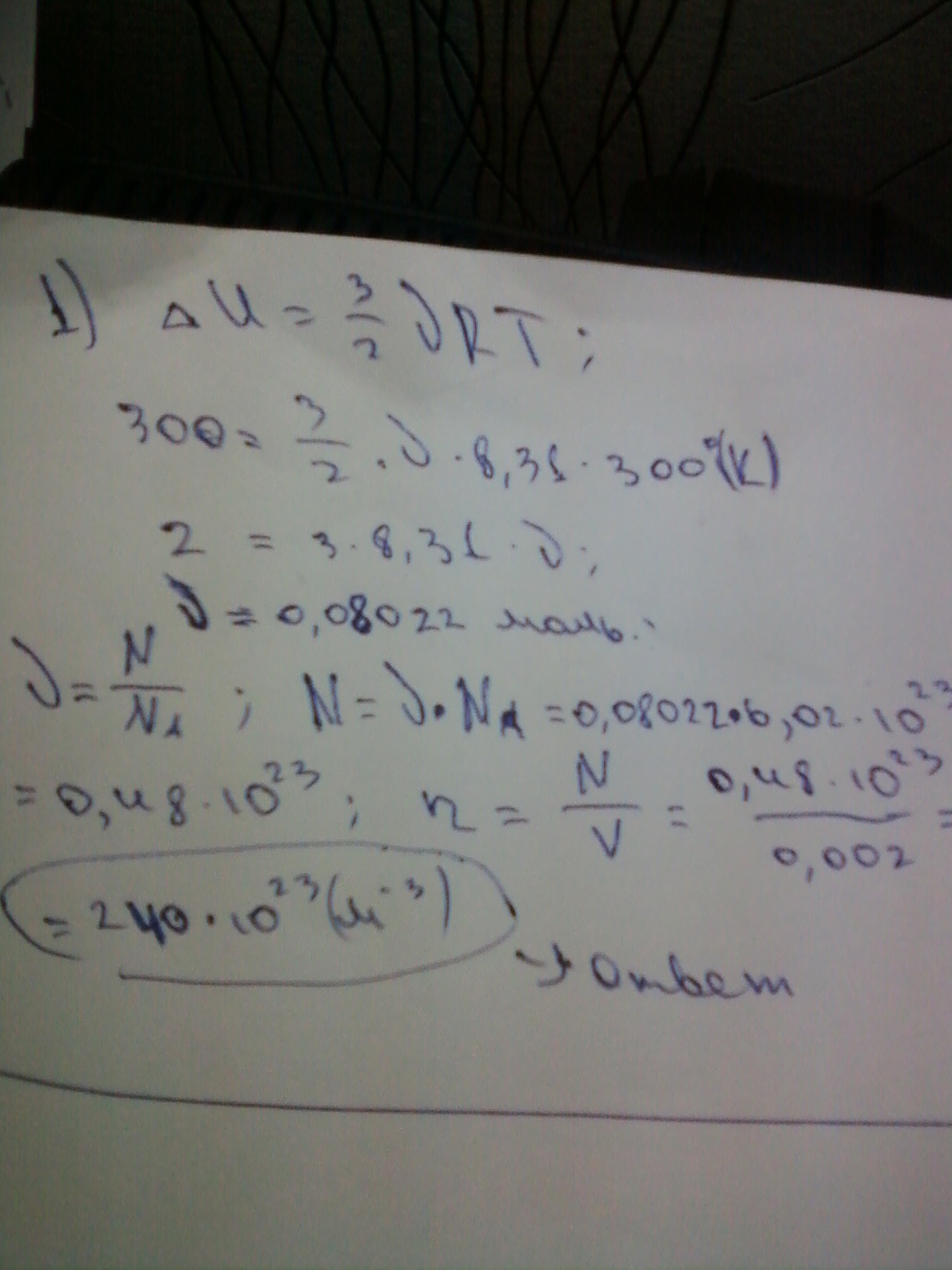 №1.Найдите концентрацию молекул идеального газа в сосуде вместимостью 2 л при температуре 27 0С, если внутренняя энергия его равна 300 Дж.