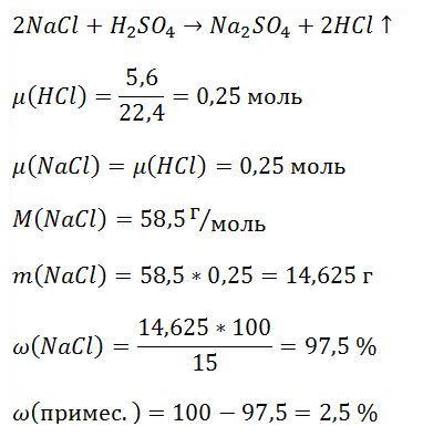 При обработке 15 г технической поваренной соли концентрированной серной кислотой выделилось 5,6 л газа(н.у). Рассчитайте массовую долю(%) примесей в поваренной соли.