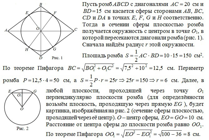 Все стороны ромба, диагонали которого равны 15 см и 20 см, касаются сферы радиуса 10 см. Найдите расстояние от центра сферы до плоскости ромба